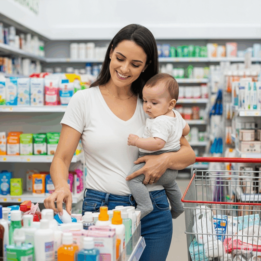 Fraldas, lenços umedecidos, pomadas, shampoos e medicamentos infantis.